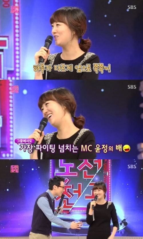 장윤정은 9일 방송된 SBS 예능 프로그램 '도전천곡'에 출연해 "(출산일이 다가오면서) 하루가 다르게 앞으로 배가 쭉쭉 나오고 있다"고 너스레를 떨었다.