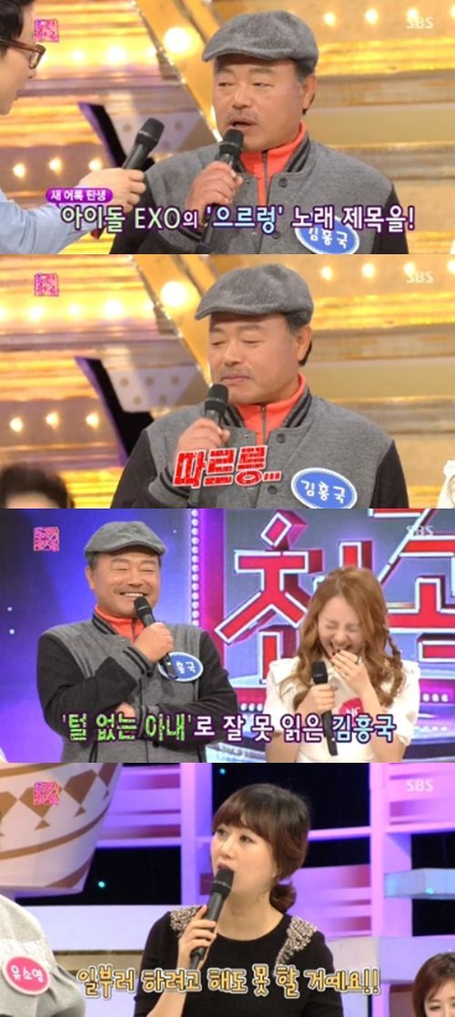 김흥국은 9일 방송된 SBS 예능 프로그램 '도전천곡'에 출연해 "엑소의 '으르렁'을 '따르릉'으로 말했다"고 고백해 웃음바다를 만들었다.