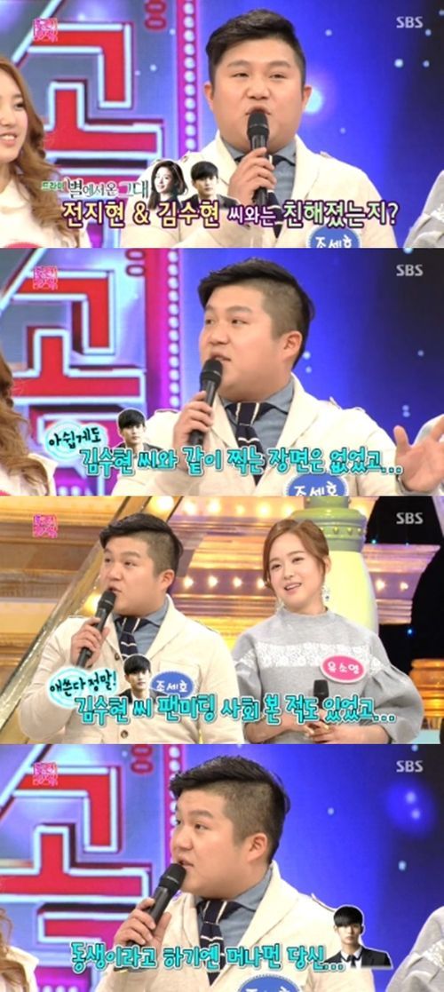 조세호는 9일 방송된 SBS 예능 프로그램 '도전천곡'에 출연해 "드라마 '별에서 온 그대'를 하면서 김수현 씨와 함께 연기를 한 적은 없지만 팬미팅 사회를 본 적이 있다"며 친분을 자랑했다.