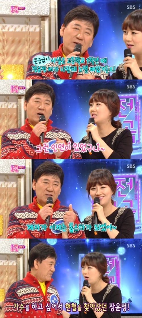 현철은 9일 방송된 SBS 예능 프로그램 '도전천곡'에 출연해 "장윤정이 고1 때 나한테 노래를 배웠다. 요즘 톱스타가 돼 항상 기쁘게 생각한다"고 말했다.