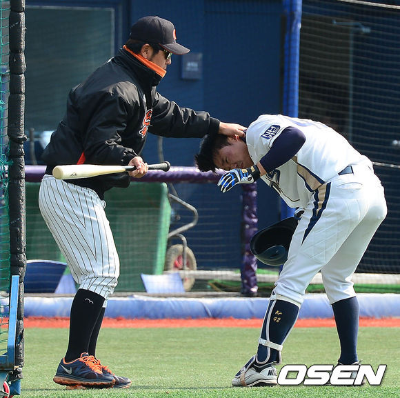 9일 오전 창원시 마산야구장에서 열리는 '2014 한국야쿠르트 세븐 프로야구' 시범경기 NC 다이노스와 롯데 자이언츠의 경기 시작전 강민호와 김태군이 장난을 치고 있다. 강민호는 전날 경기에서 김태군과 홈에서 충돌 후 왼쪽 어깨에 타박상을 입었다.