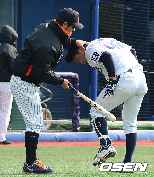 9일 오전 창원시 마산야구장에서 열리는 '2014 한국야쿠르트 세븐 프로야구' 시범경기 NC 다이노스와 롯데 자이언츠의 경기 시작전 강민호가 김태군이 장난을 치고 있다. 강민호는 전날 경기에서 김태군과 홈에서 충돌 후 왼쪽 어깨에 타박상을 입었다.