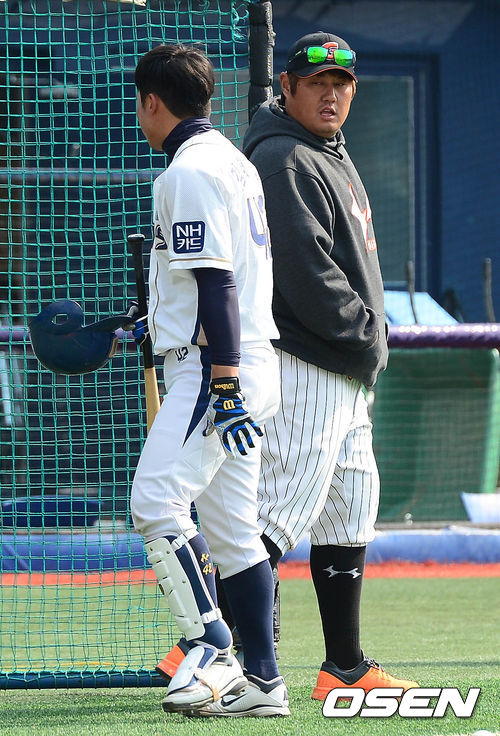 9일 오전 창원시 마산야구장에서 열리는 '2014 한국야쿠르트 세븐 프로야구' 시범경기 NC 다이노스와 롯데 자이언츠의 경기 시작전 최준석과 김태군이 이야기를 나누고 있다.