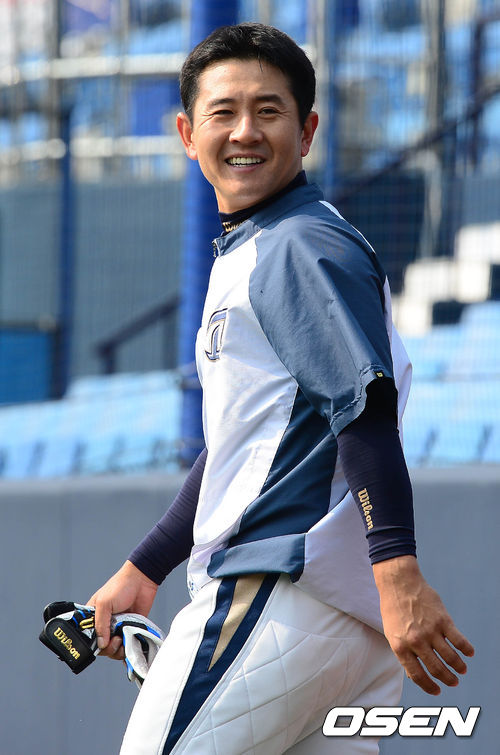 9일 오전 창원시 마산야구장에서 열리는 '2014 한국야쿠르트 세븐 프로야구' 시범경기 NC 다이노스와 롯데 자이언츠의 경기 시작전 손시헌이 훈련을 하며 미소를 짓고 있다.