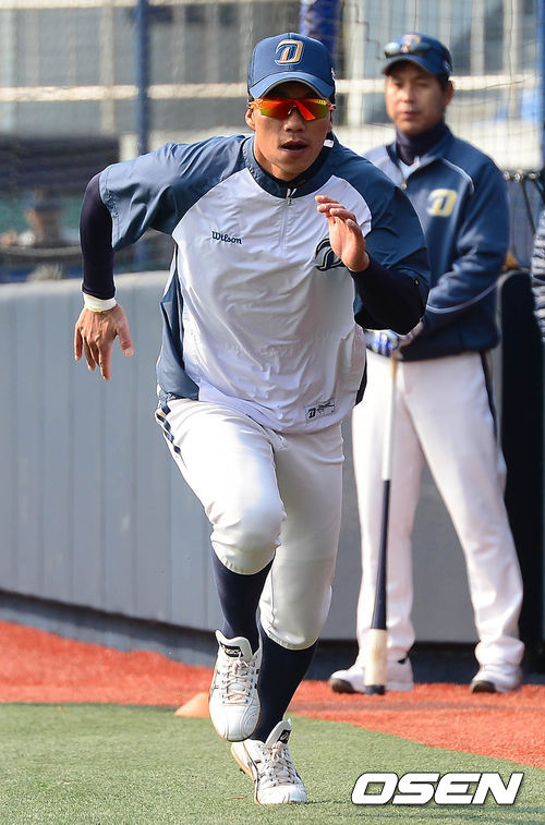 9일 오전 창원시 마산야구장에서 열리는 '2014 한국야쿠르트 세븐 프로야구' 시범경기 NC 다이노스와 롯데 자이언츠의 경기 시작전 이종욱이 러닝을 하고 있다.