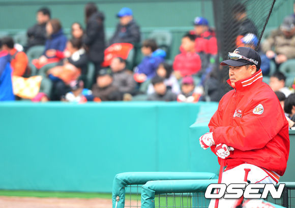 9일 오후 대전 한밭야구장에서 열리는 '2014 프로야구' 시범경기 한화 이글스와 SK 와이번스의 경기를 앞두고, SK 이만수 감독이 선수들의 훈련을 지켜보고 있다.
