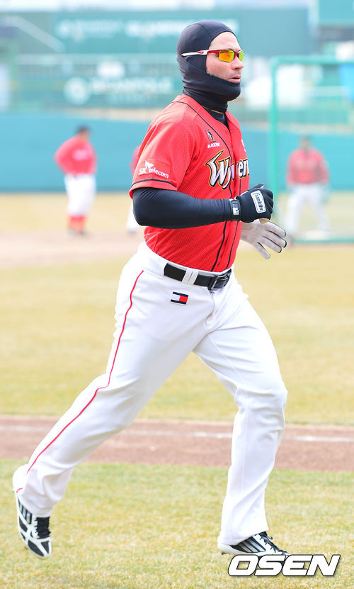 9일 오후 대전 한밭야구장에서 열리는 '2014 프로야구' 시범경기 한화 이글스와 SK 와이번스의 경기를 앞두고, SK 스캇이 주루 훈련을 진행하고 있다.