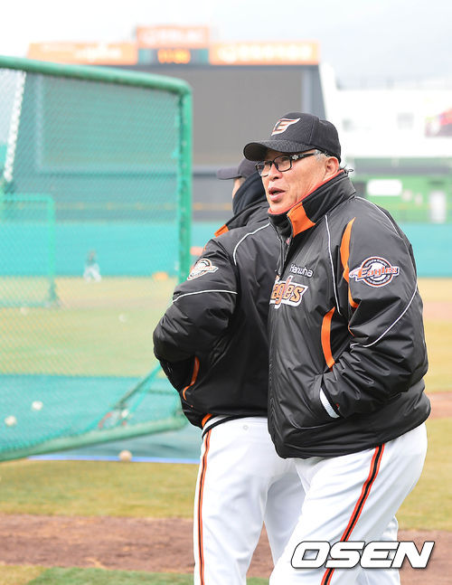 9일 오후 대전 한밭야구장에서 열리는 '2014 프로야구' 시범경기 한화 이글스와 SK 와이번스의 경기를 앞두고, 한화 김응룡 감독이 선수들의 플레이를 살피기 위해 그라운드로 나서고 있다.