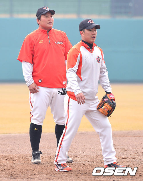 9일 오후 대전 한밭야구장에서 열리는 '2014 프로야구' 시범경기 한화 이글스와 SK 와이번스의 경기를 앞두고, 한화 정근우와 김태균이 수비 훈련을 진행하고 있다.