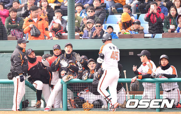 2회말 한화 공격 선두타자로 나선 정현석이 좌중간 솔로포를 날리고 홈을 밟은 뒤 더그아웃 동료들과 인사를 나누고 있다.