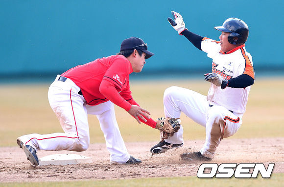 5회말 한화 공격 2사 1루 상황 정근우가 2루 도루를 시도하다 SK 유격수 신현철의 태그에 걸려 아웃되고 있다.