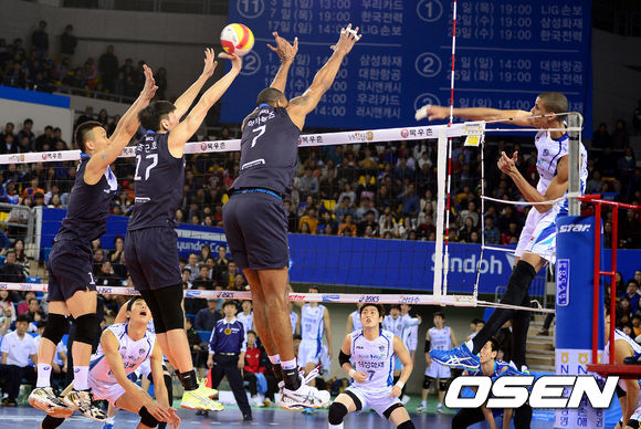 2세트 삼성화재 세트포인트에서 레오가 현대캐피탈 임동규, 조근호, 아가메즈의 블로킹을 피해 강타를 날리고 있다.