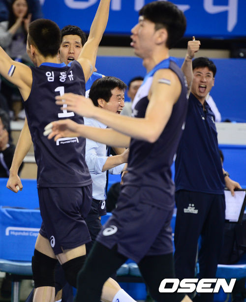 2세트 현대캐피탈 임동규가 블로킹에 성공하며 김호철 감독이 기뻐하고 있다.