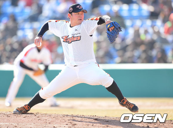 9회초 SK 공격 때 마운드에 오른 한화 투수 송창식이 힘차게 공을 뿌리고 있다.