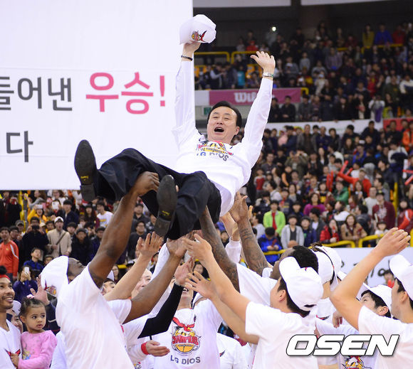 9일 오후 창원 실내체육관에서 열린 '2013-2014 KB국민카드 프로농구' 창원 LG와 부산 KT의 경기 종료 후 김진 감독이 헹가래를 받고 있다.