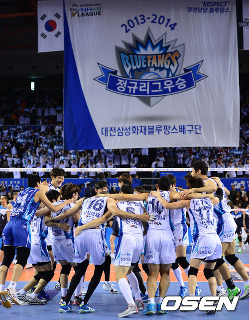 삼성화재는 9일 오후 천안유관순체육관서 열린 NH농협 2013-2014시즌 V리그 남자부 5라운드 현대캐피탈과 원정 경기서 세트스코어 3-1(22-25, 25-23, 25-17, 25-20)로 역전승을 거두며 정규리그 우승을 확정지었다.