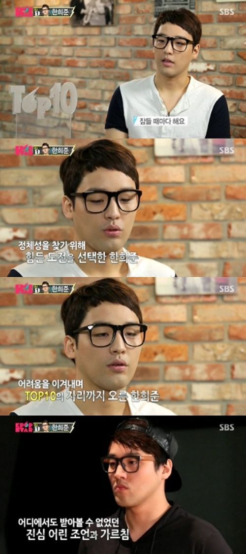 한희준은 9일 방송된 'K팝스타3'에서 "잠들 때마다 출연한 것을 후회했다"며 서바이벌에 대한 부담감을 토로했다. 하지만 이어 "이겨내면서 뿌듯하기도 했다. 'K팝스타'는 서바이벌이지만 학교 같은 곳이다"고 말했다.