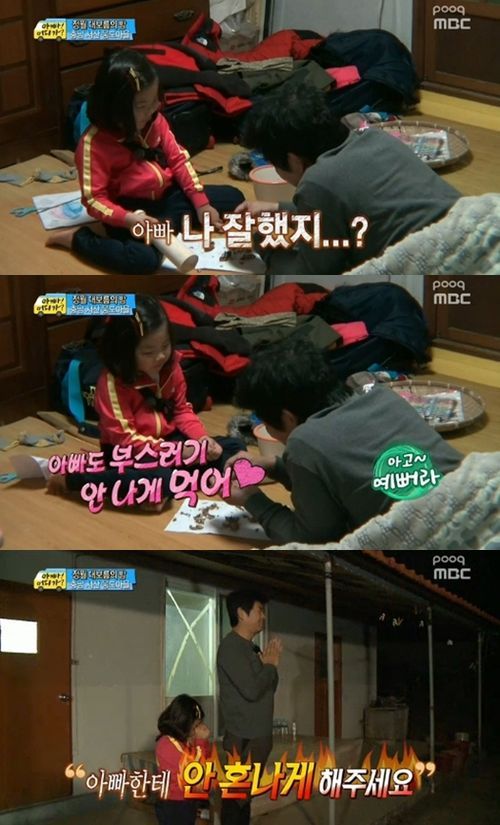 한편 이날 '아빠어디가' 성동일-빈 부녀, 김성주-민율 부자, 윤민수-후 부자, 김진표-규원 부녀, 류진-임찬형 부자, 안정환-리환 부자 등 여섯 아빠와 아이들은 충남 서산 웅도로 여행을 떠났다.