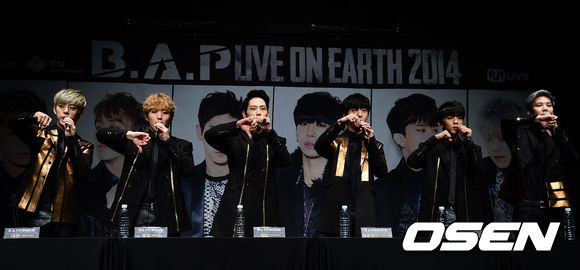 B.A.P는 9일 오후 서울 방이동 올릭픽공원 내 뮤즈라이브홀에서 열린 2014년 단독 콘서트 '비에이피 라이브 온 어스 서울 2014(B.A.P LIVE ON EARTH SEOUL 2014)' 기자간담회를 통해 공연과 공연을 앞둔 소감을 전했다.