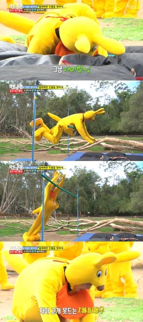 김우빈은 9일 방송된 SBS 예능 프로그램 '일요일이 좋다 - 런닝맨'에서 캥거루 옷 입고 높이 뛰기에 도전했다.