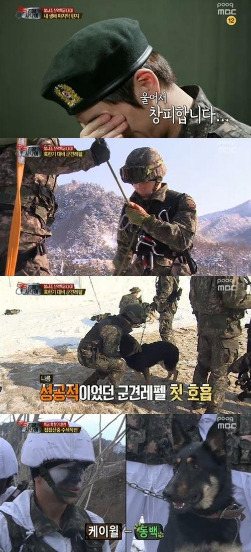 이어 그는 레펠 훈련을 통해 익힌 하강법으로 진짜 헬기에서도 무사히 하강하는데 성공했다. 또한 힘 넘치는 군견 동백이와 함께 대항군을 찾아내며 훌륭히 작전에 임했다.