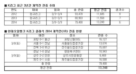 3월 8일과 9일 총 6개 경기장에서 열린 ‘현대오일뱅크 K리그 클래식’ 1라운드 경기에 평균 1만 3248명이 입장, 실관중 집계를 시작한 2012년 이후 개막전 최다 평균 관중을 기록했다.