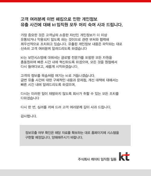 지난 6일 KT의 홈페이지가 해킹 돼 1200만 명의 개인정보가 유출된 사실이 경찰조사 결과 드러났다. KT는 사과문을 통해 "6일 경찰에서 발표한 고객정보 유출 사고와 관련 고객 피해 최소화를 위해 노력하겠다"며 "KT는 정보 유출경위에 대해 경찰조사에 적극 협조하여 사실관계를 확인할 계획"이라고 밝혔다.