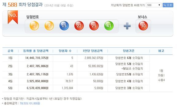 로또 588회 당첨번호가 가려졌다. 1등은 5명이 나왔다.