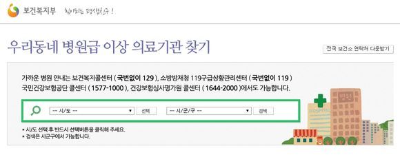보건복지부 홈페이지에 들어가면 병원급 의료기관을 시/도별로 검색할 수 있다. 이외에도 보건복지콤센터나 119구급상황관리센터, 국민보험공단에 전화하면 주변의 문 연 병원을 알 수 있다.