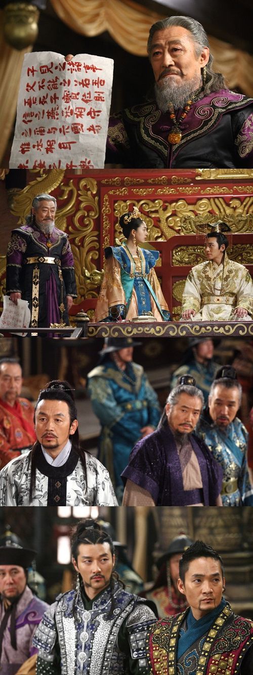10일 '기황후' 측이 공개한 현장 사진에는 극중 원나라 최고 권력자인 연철(전국환)이 황제 타환(지창욱)과 행성주들 앞에서 혈서를 꺼내드는 모습이 담겼다.