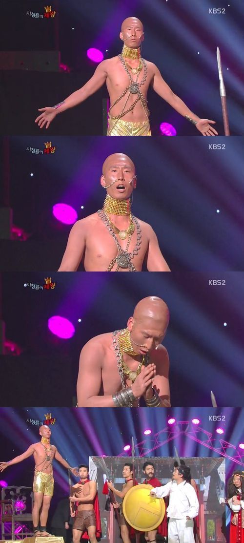 이날 '개그콘서트'에서는 양상국이 영화 '300'의 페르시아 왕을 패러디했다. 양상국은 '시청률의 제왕' 코너에 출연해 온몸에 금줄을 달고 민머리 차림새인 '300' 페르시아 왕 캐릭터로 나타나 웃음을 자아냈다.
