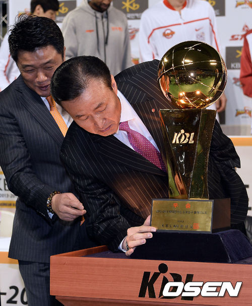 10일 오전 서울 잠실학생체육관서 진행된 '2013~2014 KB국민카드 프로농구' 플레이오프 미디어데이에서 LG 김진 감독이 트로피를 만지고 있다