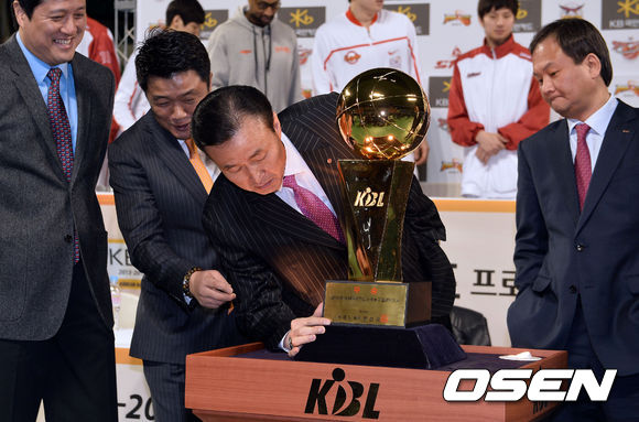 10일 오전 서울 잠실학생체육관서 진행된 '2013~2014 KB국민카드 프로농구' 플레이오프 미디어데이에서 김진 감독이 트로피를 만지고 있다