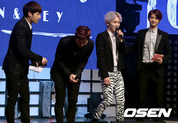 10일 오후 서울 삼성동 코엑스 아티움에서 열린 유닛 그룹 '투하트(Toheart)' 더 퍼스트 미니 앨범(The 1st Mini Album) 쇼케이스에서 키와 우현이 샤이니 멤버 민호와 인피니트 성규와 인사를 나누고 있다.
