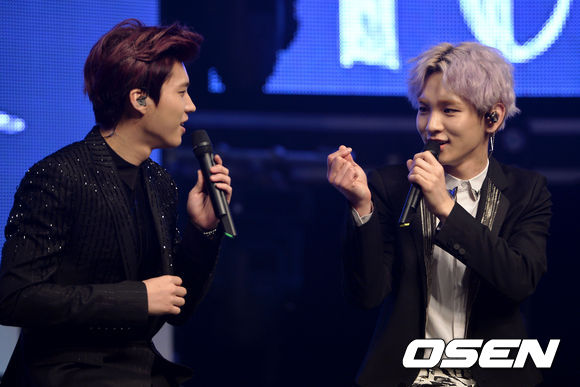 10일 오후 서울 삼성동 코엑스 아티움에서 열린 유닛 그룹 '투하트(Toheart)' 더 퍼스트 미니 앨범(The 1st Mini Album) 쇼케이스에서 투하트 키가 손가락으로 하트를 보이고 있다.