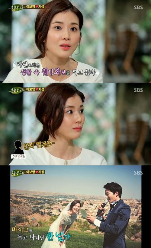 이보영은 지난 10일 오후 방송된 SBS 예능프로그램 '힐링캠프-기쁘지 아니한가'에서 스페인으로 웨딩화보 촬영차 떠났다 지성에게 받은 프러포즈에 대해 털어놨다.