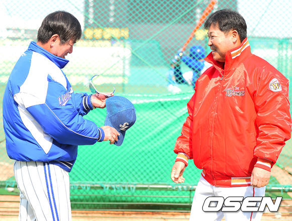 11일 오전 대구 시민구장에서 열리는 '2014 프로야구 시범경기' 삼성 라이온즈와 SK 와이번스의 경기를 앞두고, SK 이만수 감독과 삼성 류중일 감독이 인사를 나누고 있다.