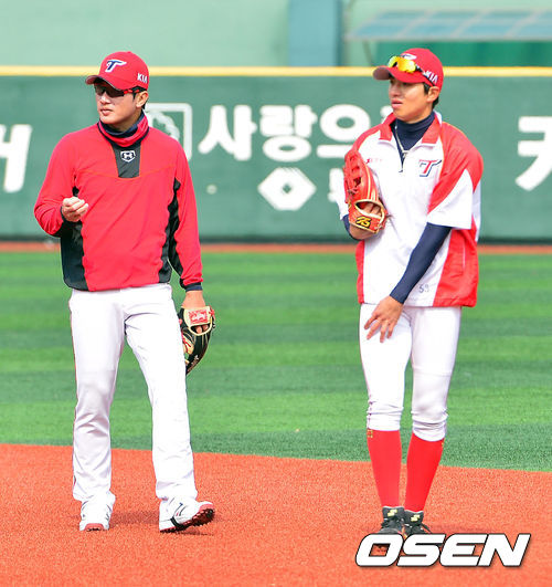 11일 서울 목동구장에서 열리는 '2014 프로야구 시범경기' 넥센 히어로즈와 KIA 타이거즈의 경기전 KIA 이대형과 김주찬이 훈련을 마치고 더그아웃으로 들어가고 있다.