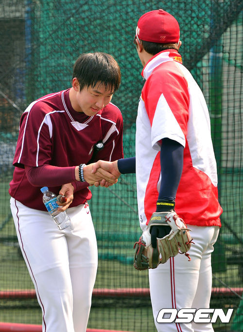 11일 서울 목동구장에서 열리는 '2014 프로야구 시범경기' 넥센 히어로즈와 KIA 타이거즈의 경기전 KIA 김민우가 넥센 강윤구와 악수를 나누고 있다. 김민우는 이번 시즌에 앞서 넥센에서 KIA로 트레이드 됐다.