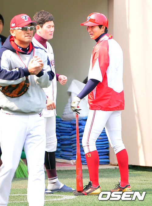 11일 서울 목동구장에서 열리는 '2014 프로야구 시범경기' 넥센 히어로즈와 KIA 타이거즈의 경기전 KIA 이대형과 넥센 이성열이 이야기를 나누고 있다.