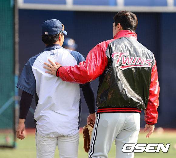 11일 오후 창원 마산야구장에서 열린 '2014 한국야쿠르트 세븐 프로야구' 시범경기 NC 다이노스와 LG 트윈스의 경기, 경기에 앞서 NC 이종욱과 LG 김선우가 인사를 나누고 있다.