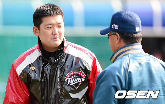 11일 오후 창원 마산야구장에서 열린 '2014 한국야쿠르트 세븐 프로야구' 시범경기 NC 다이노스와 LG 트윈스의 경기, 경기에 앞서 LG 김선우와 NC 김경문 감독이 인사를 나누고 있다.