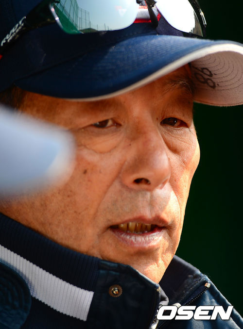 경기에 앞서 두산 송일수 감독이 취재진과 이야기를 나누고 있다.