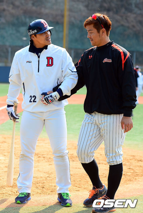 경기에 앞서 두산 홍성흔이 롯데 강민호와 이야기를 나누고 있다.