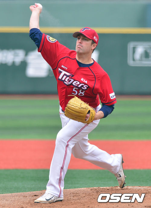 11일 서울 목동구장에서 열리는 '2014 프로야구 시범경기' 넥센 히어로즈와 KIA 타이거즈의 경기, 1회말 kIA 선발투수 홀튼이 역투하고 있다.
