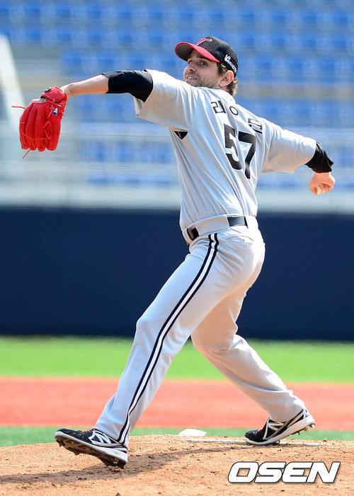11일 오후 창원 마산야구장에서 열린 '2014 한국야쿠르트 세븐 프로야구' 시범경기 NC 다이노스와 LG 트윈스의 경기, 1회말 무사에서 LG 선발투수 리오단이 힘차게 공을 던지고 있다.