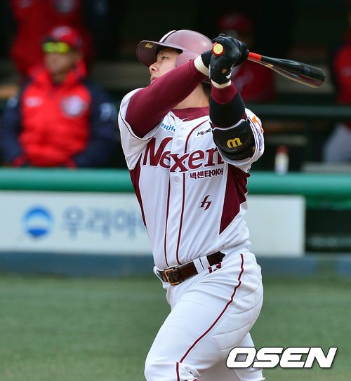 11일 서울 목동구장에서 열리는 '2014 프로야구 시범경기' 넥센 히어로즈와 KIA 타이거즈의 경기, 1회말 2사 넥센 윤석민이 외야플라이 타구를 날리고 있다.