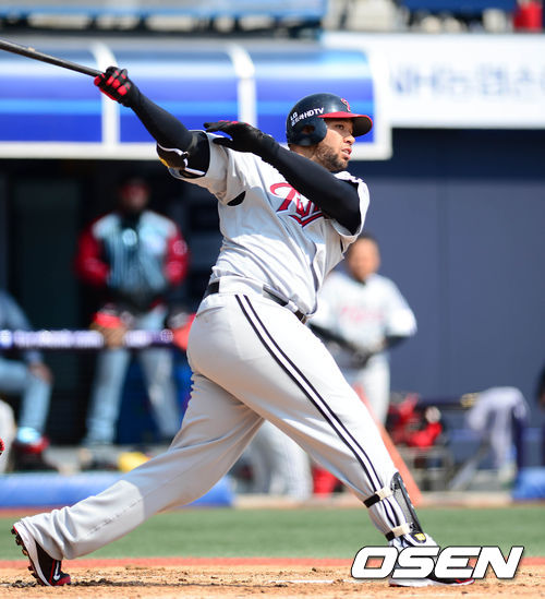 11일 오후 창원 마산야구장에서 열린 '2014 한국야쿠르트 세븐 프로야구' 시범경기 NC 다이노스와 LG 트윈스의 경기, 2회초 LG 벨이 내야땅볼을 치고 있다.