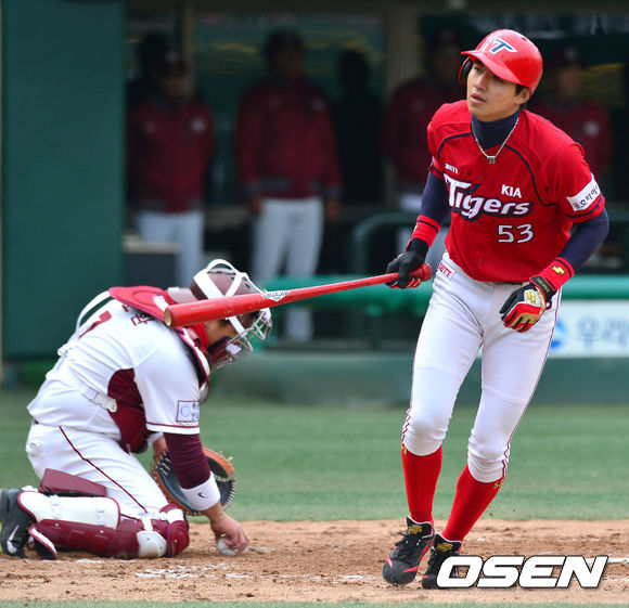 11일 서울 목동구장에서 열리는 '2014 프로야구 시범경기' 넥센 히어로즈와 KIA 타이거즈의 경기 3회초 무사 1,2루 KIA 이대형이 볼넷으로 진루하고 있다