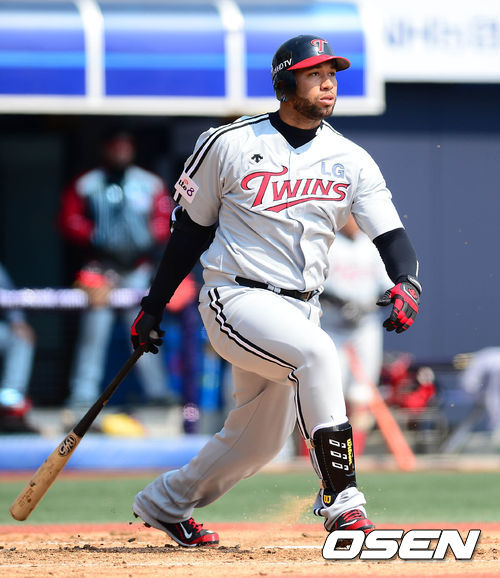 11일 오후 창원 마산야구장에서 열린 '2014 한국야쿠르트 세븐 프로야구' 시범경기 NC 다이노스와 LG 트윈스의 경기, 2회초 LG 벨이 내야땅볼을 치고 있다.